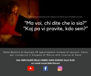 Sul sito dell’arcidiocesi all’indirizzo internet www.gorizia.chiesacattolica.it sul canale youtube (Chiesadigorizia) e sulla pagina facebook dell’Arcidiocesi (ArcidiocesidiGorizia) ogni sera alle ore 18 è stato proposto un video con la lettura del passo evangelico curata a più voci da alcuni attori fuori campo: il testo ascoltato offrirà al vescovo lo spunto per il proprio breve commento destinato proprio a rispondere alla domanda “chi è Gesù”.