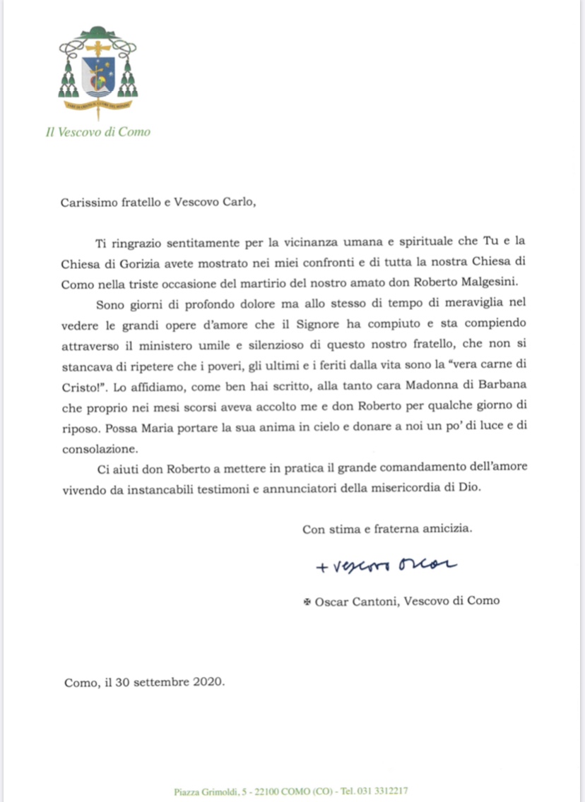 Il legame speciale con la Madonna di Barbana di don Roberto Malgesini, il direttore della Caritas di Como, ucciso nei giorni scorsi, testimoniato dal vescovo della città lariana, mons. Cantoni in questa lettera al vescovo Carlo.