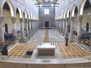 Sicuramente qualcuno di voi era presente ieri sera ad ascoltare l’interessante lectio del card. Cantoni sul legame tra il patriarcato di Aquileia e la diocesi di Como, di cui il cardinale è vescovo. Una lezione di storia, che ci ha ricordato le complesse vicende ecclesiali, sociali e politiche che hanno coinvolto per secoli la realtà di Aquileia, delle Chiese e dei territori che a essa si riferivano, all’interno del più vasto contesto della storia della Chiesa e della sua collocazione in Europa e in Asia. Se dovessimo quest’oggi concentrarsi non più sul patriarcato, ma solo su questa basilica, ci sarebbe spazio per un’altra lectio che coinvolgerebbe non più solo le vicende ecclesiali, sociali e politiche di secoli, ma anche quelle fisiche come distruzioni, incendi, terremoti e, per fortuna, anche ricostruzioni che nel tempo hanno interessato questo edificio di culto.